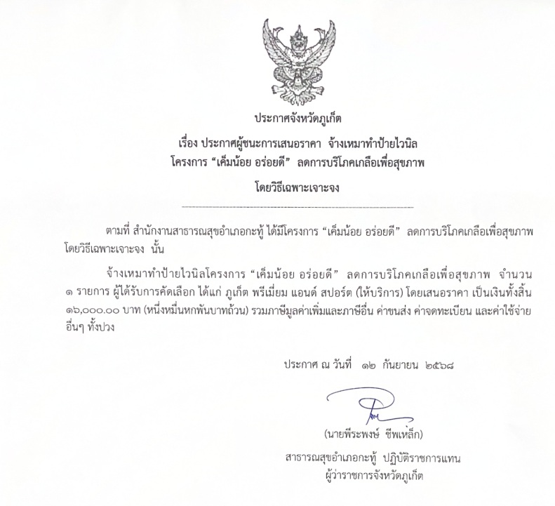 ประกาศผู้ชนะการเสนอราคา จ้างเหมาทำป้ายไวนิล โครงการ “เค็มน้อย อร่อยดี” ลดการบริโภคเกลือ เพื่อสุขภาพ โดยวิธีเฉพาะเจาะจง
