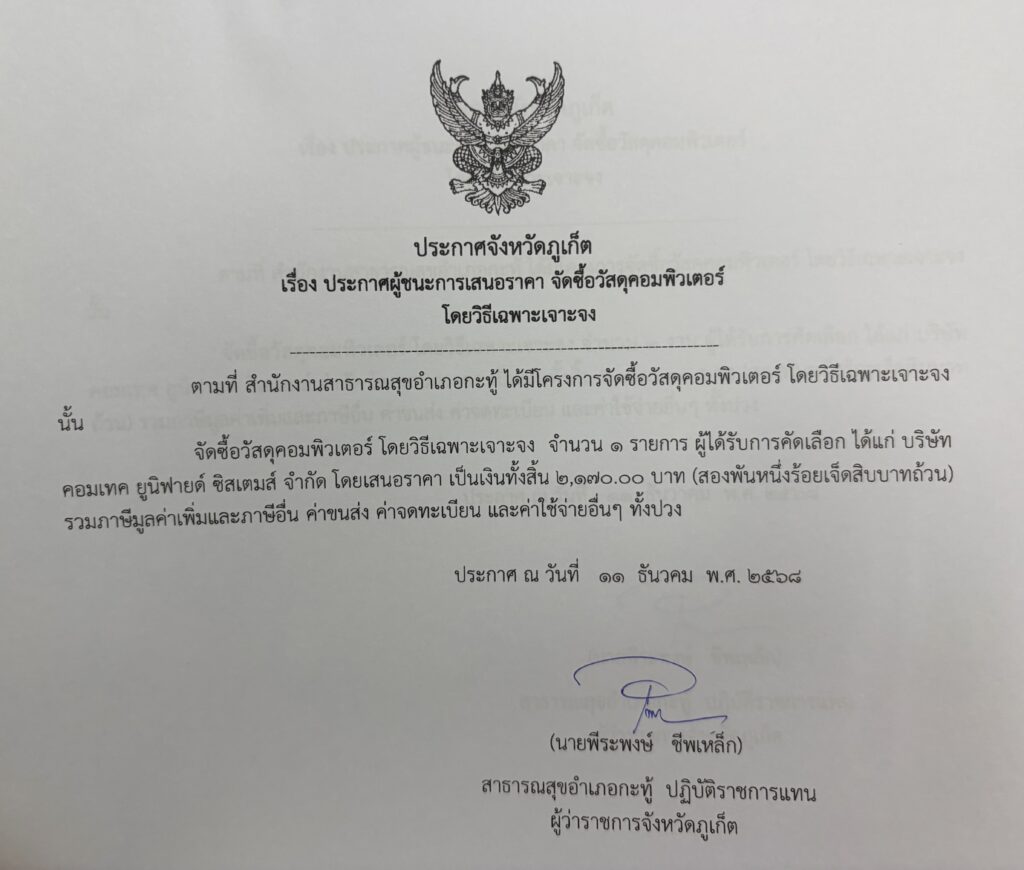 ข่าวจัดซื้อจัดจ้าง สำนักงานสาธารณสุขอำเภอกะทู้ ประกาศผู้ชนะการเสนอราคาจัดซื้อวัสดุคอมพิวเตอร์ ธันวาคม 19, 2025ธันวาคม 19, 2025 สำนักงานสาธารณสุขอำเภอกะทู้ Share