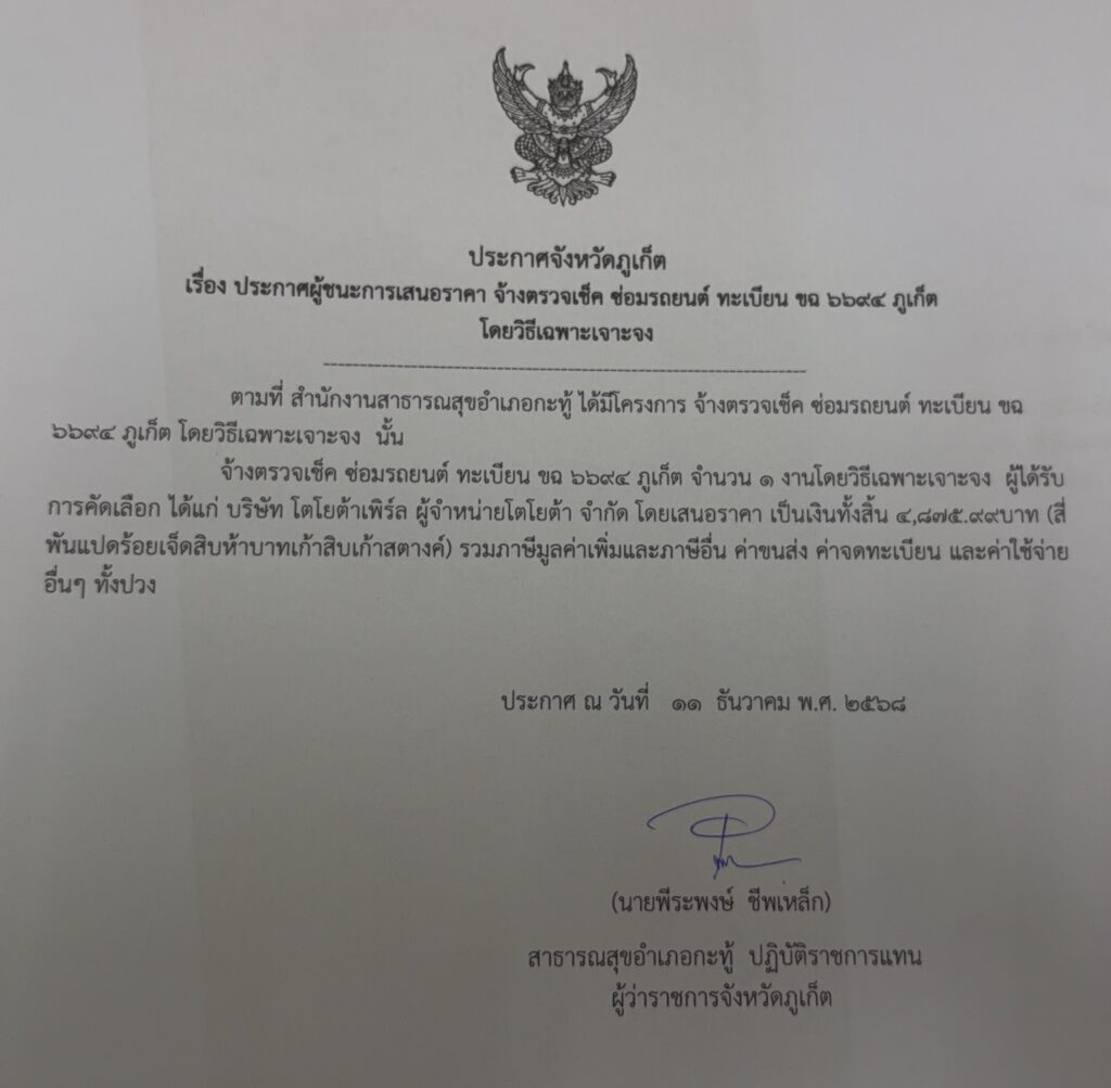 ข่าวจัดซื้อจัดจ้าง สำนักงานสาธารณสุขอำเภอกะทู้ ประกาศผู้ชนะการเสนอราคาจ้างตรวจเช็ค ซ่อมรถยนต์ ทะเบียน ขฉ 6694 ภูเก็ต ธันวาคม 19, 2025ธันวาคม 19, 2025 สำนักงานสาธารณสุขอำเภอกะทู้ Share